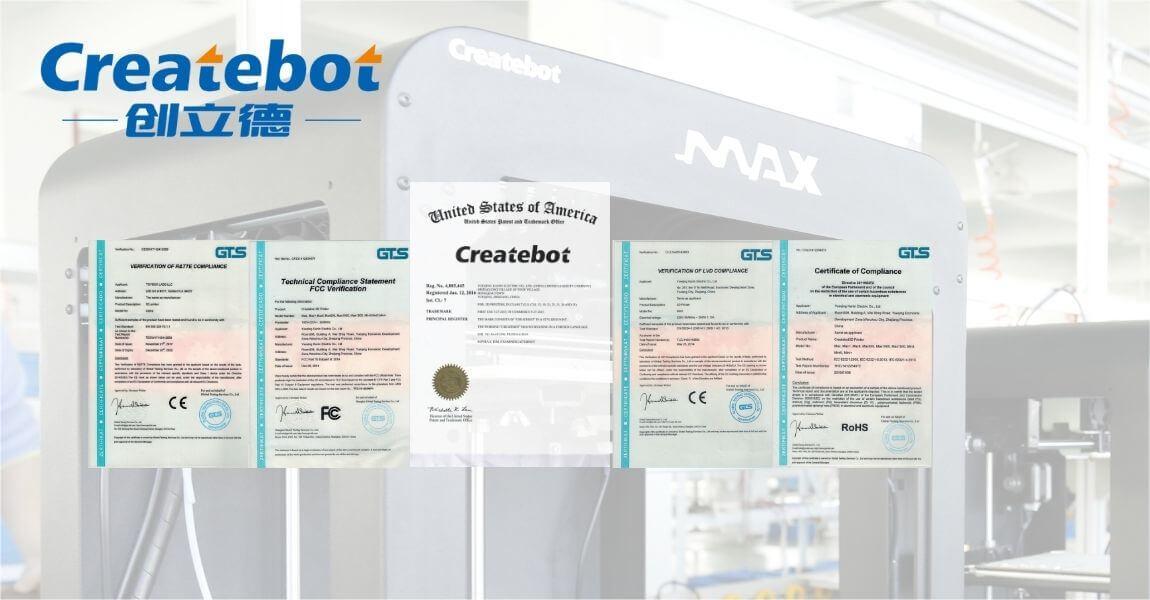 Createbot has CE, ROHS, FCC, ISO9001 Certificates, National Patents, and China 3D Printer Special Contribution Award etc.